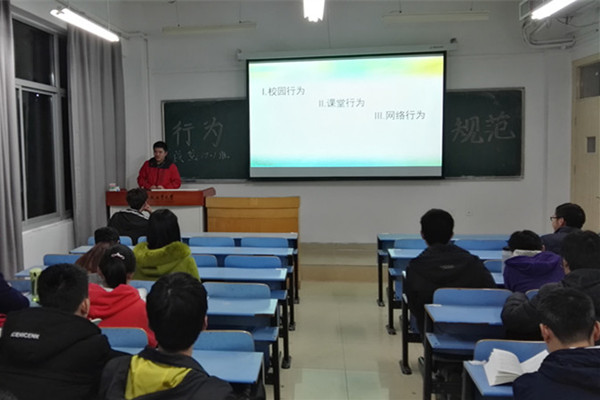 紧接着,部分同学上台演讲,分享自己对于行为规范教育的一些想法。他从自身在生活中的一些经历说起,比如小黄车上的“不明物体”和不翼而飞的车铃,曾经屡屡发生的迟到现象,宿舍里的喧哗,听来有趣,却又引人深思。最后,他呼吁同学们,谨遵校规校纪,做文明人,行文明事,落实到具体行动中,共同开创良好风气。班会最后,辅导员进行总结,要求每一位同学都能在学习生活中规范自身言行,努力学习,为母校、学院争光添彩。