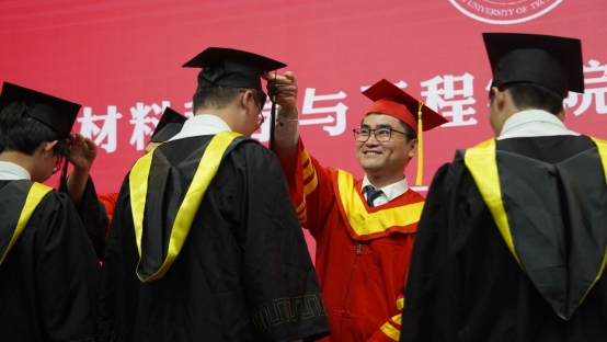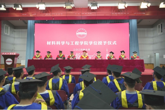 仪式在庄严的国歌声中拉开帷幕。jbo竞博官网登录党委书记吕珺宣读了《jbo竞博官网登录关于授予2024届毕业生学位的决定》,授予材料科学与工程专业刘永超等6名博士研究生博士学位、材料物理与化学专业李华博等168名硕士研究生硕士学位、金属材料工程专业高照等269名本科生学士学位。主席台领导、老师为获得学位的全体学生颁发学位证书、扶正流苏,并与毕业生合影留念。