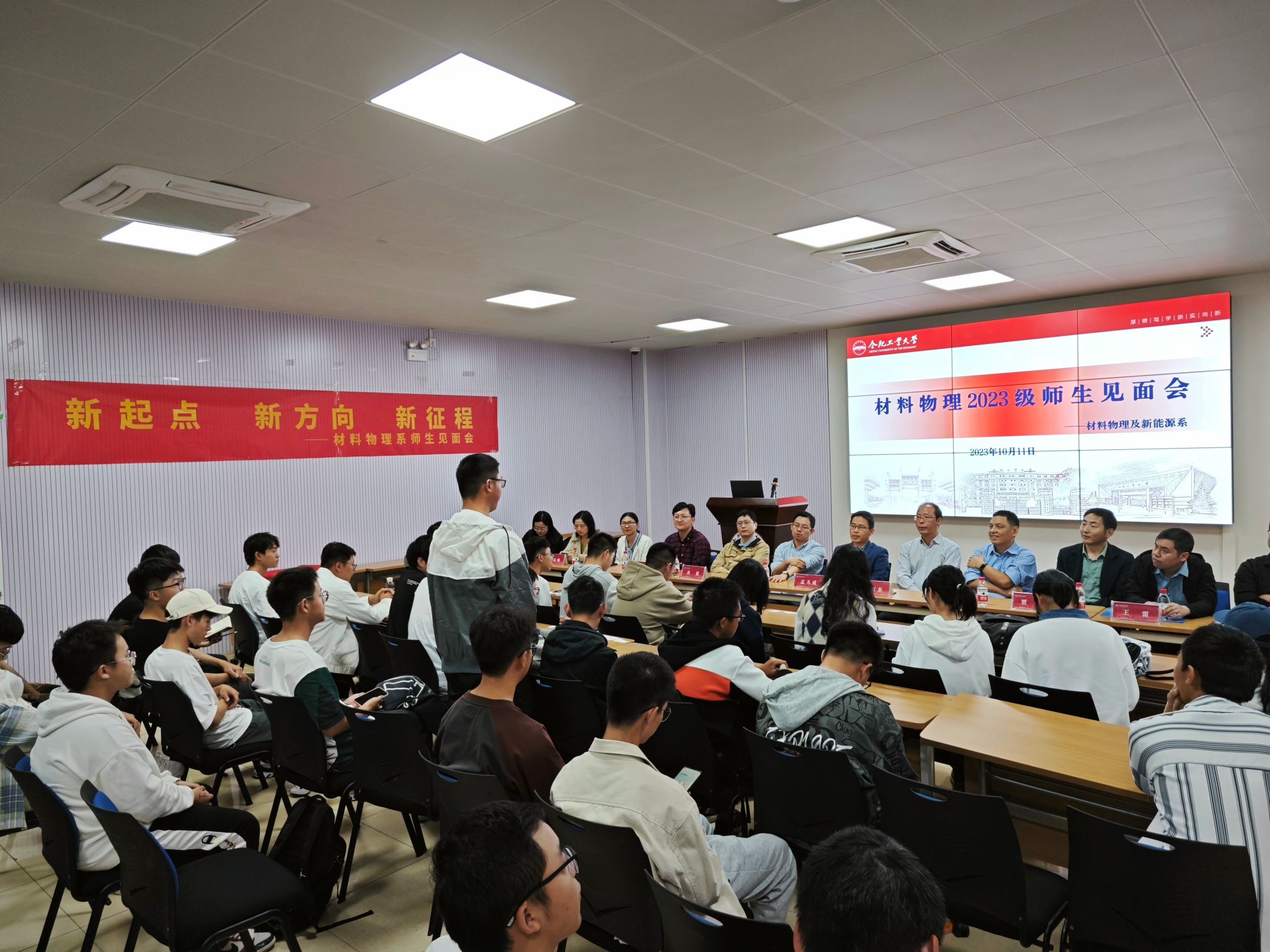 活动在师生们简短而有趣的自我介绍环节中正式拉开帷幕。同学们一一介绍了自己的家乡、个人爱好以及对所学专业的看法,从个人理想、大学规划等方向积极展望,展现了新生的蓬勃朝气。随后,材料物理系教师代表围绕工作经历、研究方向等方面开展自我介绍,纷纷寄语新生,表达了对新一届同学们的殷切希望。