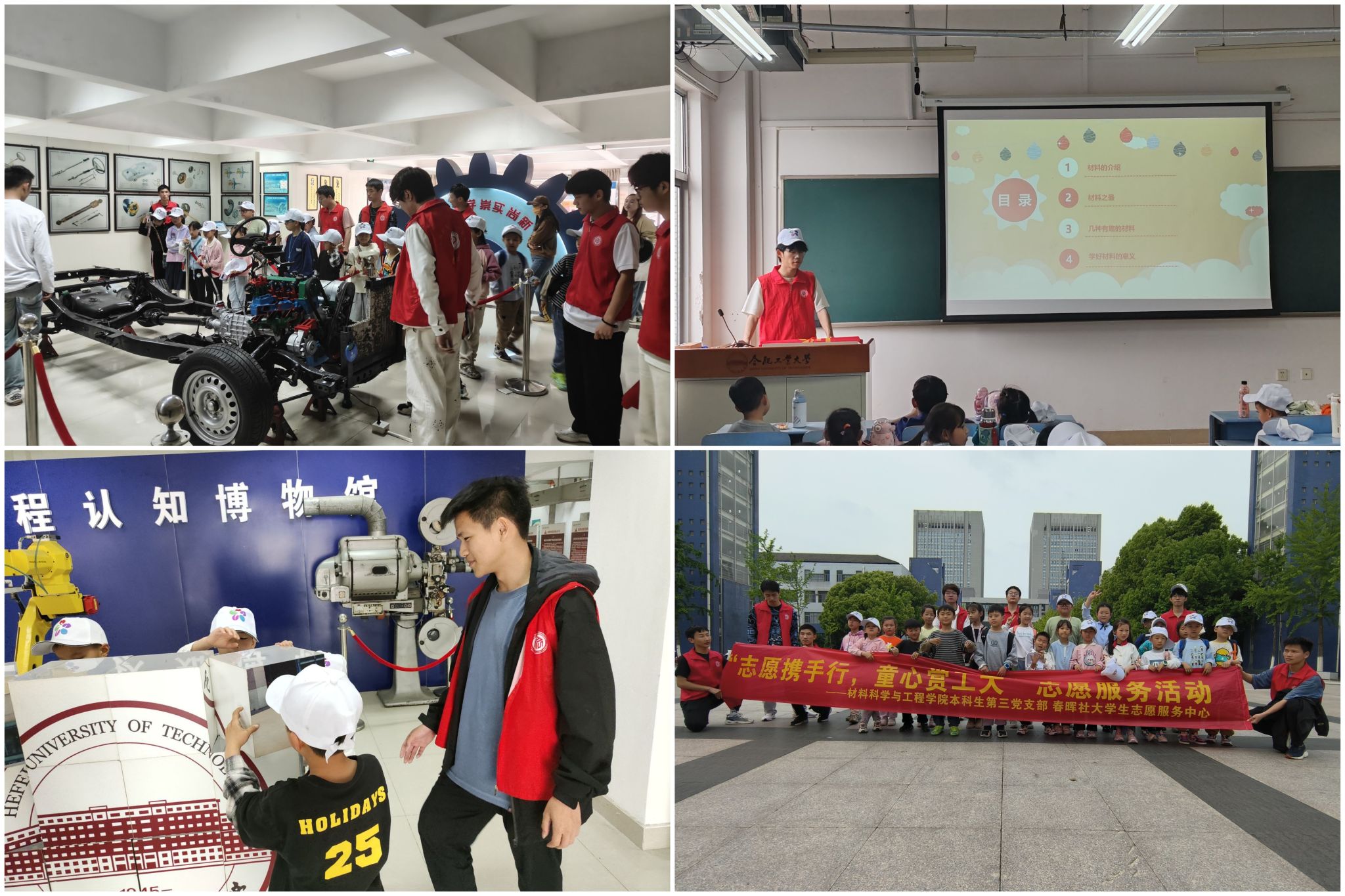 志愿者陪伴合肥华益公益服务中心的自闭症儿童们参观了翡翠湖校区。在志愿者的引导下,孩子们在励人湖边与黑天鹅近距离接触,参观图书馆感受浓厚的学习氛围,到工程认知博物馆后被工程器械和设备吸引,认真观察,倾听讲解,探索未知。最后,志愿者在教室向小朋友们讲述了材料学科趣谈,为孩子们上了一节生动的材料科普课,活动在轻松愉快的氛围中结束。