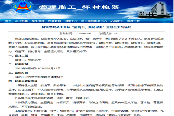 征文活动开展以来,全院学生积极投稿,以高度的热情支持本次活动——投稿的同学们或激情澎湃,写出了自己对医疗工作者的赞赏与敬佩;或以一个大学生的角度,讲述自己的所见所闻所感。一篇篇征文,承载了jbo竞博官网登录全体学生对战斗在疫情一线“抗疫者”们崇高的敬意,承载着同学们对必将战胜这场疫情攻坚战的信心。虽然该院的同学们大都无法奔赴“抗疫”前线,但是只要心系祖国,积极响应国家、政府以及学校号召,做好自我防护,居家安心学习,就是用实际行动贡献出了属于我们的青春力量!