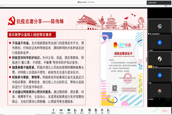 弘扬雷锋精神,强化青春责任勇担——积极宣传青年学子抗疫事迹。自疫情发生以来,学院广大青年团员积极响应上级党组织和团组织的号召,在做好自我防护的同时,在关键时刻挺身而出,用实际行动助力防“疫”,积极投身于家乡疫情防控志愿服务工作,将弘扬和践行雷锋精神融入抗“疫”工作,为打赢疫情防控阻击战贡献青春力量。学院累计有30余名青年志愿者,在全国各地的社区街道、村委会、青年志愿服务点等地,开展疫情防控志愿服务工作,部分同学主动捐款捐物,涌现出吴修佳捐款8000元国家奖学金、孟令孜海外向母校捐赠口罩、金邺诚志愿服务160小时不停歇等先进典型。学院统一部署,积极组织学院志愿者们参与各班团主题班会,开展“志愿抗疫有我”经历分享会,用自身实践体会,现身说法,讲述抗“疫”过程中的身边人身边事。