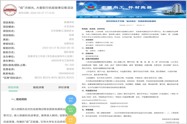 传承雷锋精神,讲述新时代雷锋故事——积极开展抗疫微故事征集活动。jbo竞博官网登录依托第二课堂平台,在全院学生中深入开展“益点微光,大爱前行”抗疫微故事征集活动,鼓励学生在疫情期间讲述抗击疫情的先进事迹,深入挖掘人物、事件中的“真、善、美、爱、乐、新”的文化主题,以大学生的视角诠释“奉献、友爱、互助、进步”的新时代精神,宣扬“爱党爱国、友爱友善、互帮互助、担当奉献”的社会责任与担当,讲述新时代雷锋故事,体悟新时代英雄事迹,讴歌新时代抗疫英雄,传播抗“疫”正能量,活动开展过程中已有近200名同学报名参加。