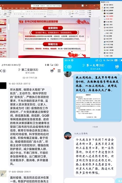 言传身教,知行合一,做好非常时期的思想引领。自新型冠状病毒感染的肺炎疫情发生以来,学院辅导员们充分调动党支部、团支部的力量,利用学习强国、网上直播、QQ直播、QQ群等平台,及时传达习近平总书记对当前新型冠状病毒感染肺炎防控工作作出的一系列重要指示精神,以及教育部、安徽省和学校关于疫情防控的政策以及工作要求,积极关注疫情防控进展,保证了学习不断线,进一步增强了疫情期间党团组织的思想引领作用。部分青年积极响应号召,充分发挥“一个支部就是一个堡垒,一名党员就是一面旗帜”的战斗堡垒和先锋模范作用,积极投身志愿服务,冲锋在疫情防控第一线,让党旗、团旗在防控疫情斗争第一线高高飘扬!材料物理2018-1班学生党员周霆宇、材料成型及控制工程17-1班学生党员杜黎明、材料类19-6班团员贺景浩、材料类19-4班钱璟,积极参与到社区防疫工作中;2019级材料类专业积极组织线上零星捐款,其中材料类19-3班何展辉个人捐款1100元。志愿者们均表示危难当头,愿意贡献自己的绵薄之力,同祖国共渡难关。