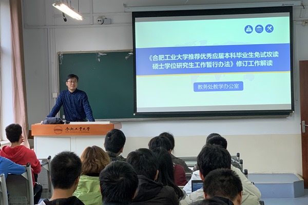 作为教务处和jbo竞博官网登录共建党支部的内容之一,11月13日下午,注册中心积极组织了有关老师,到合肥的两个校区,为jbo竞博官网登录有关年级学生介绍解读学校推荐免试研究生相关政策,以及2019版教学管理文件汇编中各项文件精神和要求,直接与同学们面对面答疑解惑,倾听意见建议,受到了广大同学们的好评。