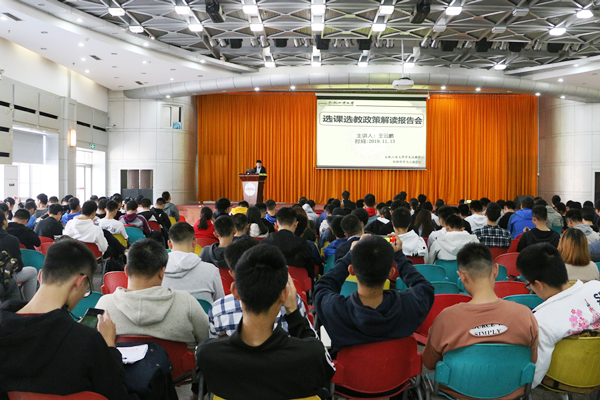 11月13日下午,在翡翠湖校区综合楼301宣讲厅,注册中心王云鹏老师分别从选课选教重要性、时间节点、注意事项四个方面描述了同学们选课过程中要在了解本专业的指导性教学计划的前提下结合专业、兴趣、时间地点等完成选课,同学们积极参与互动,提出问题,王老师作了一一解答。此次报告会向学生介绍选课机制的同时,增强了学生在教学活动中的参与意识,激励学生合理安排时间发展兴趣,在学校资源允许的前提下,自主安排学习时间,为进一步推进我校学分制教学改革奠定了基础。全体19级新生和部分二年级本科生三百多人参会。