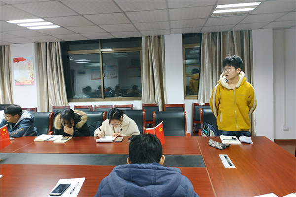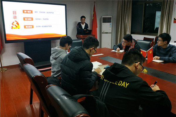 本次学习主要围绕对标“四讲四有”做合格党员为主要内容展开,学员班第四小组组长刘超同学结合PPT向与会学员简单介绍了“四讲四有”的基本内容和时代意义。他说道:“习近平系列讲话精神要求我们大学生着力在坚定理想信念上下功夫,在掌握科学理论上下功夫,在理论联系实际上下功夫,切实做到学而信、学而用、学而行。十九大以来,党中央号召在全体党员中开展“学党章党规,学系列讲话,做合格党员”学习教育,倡导所有党员要做“讲政治、有信念,讲规矩、有纪律,讲道德、有品行,讲奉献、有作为”的合格党员。“四讲四有”是党和国家事业发展对党员的新要求,对于进一步增强党的凝聚力和战斗力,更好地应对“四大考验”“四大危险”,实现中华民族伟大复兴中国梦,具有重大意义,为如何做一名合格党员指明了方向。”