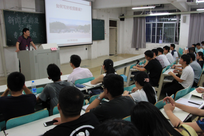 2017年5月26日晚,由jbo竞博官网登录组织的“新闻稿采编与写作” 专题讲座在翡翠湖校区召开,讲座邀请了党委宣传部周慧老师就新闻稿的采编与写作技巧给同学们进行了讲解。