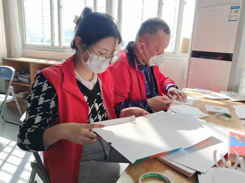 活动期间,在工坊指导老师的带领下,志愿者们协助残障人员进行手工制作,例如飞机上用的垃圾桶和商品包装盒的半成品加工,以换取部分生活补贴。在手工制作过程中,志愿者与残障人士主动进行深入交流,相互了解彼此的生活现状,同时分享各自的兴趣爱好和过往经历。志愿者们用心、用情的志愿服务工作得到了工坊工作人员的一致认同。