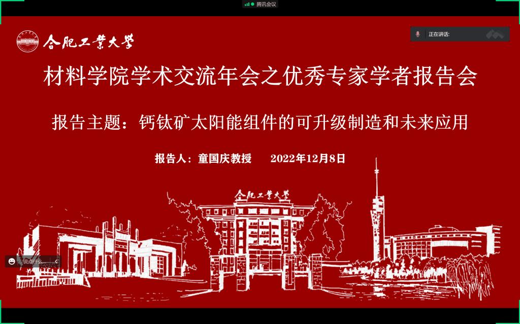 为了提高研究生学术素养,开拓学术视野,提高学生的学习兴趣,jbo竞博官网登录邀请了jbo竞博官网登录黄山学者优秀青年人才计划主持人童国庆教授于12月8日在材料楼6楼601会议室做关于钙钛矿太阳能组件的可升级制造和未来应用报告会。