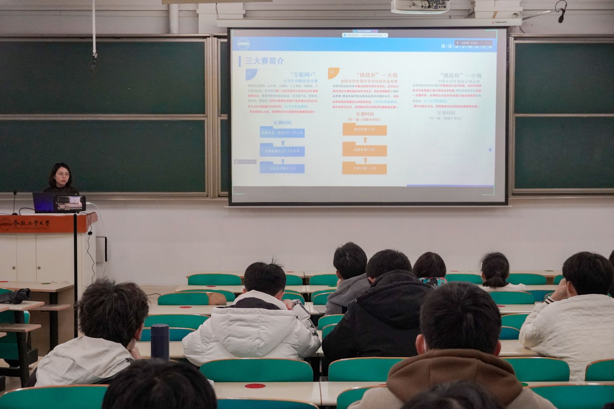 院学生工作办公室主任兼团委书记徐美波以“三大赛”为切入点,介绍了“中国国际‘互联网+’大学生创新创业大赛”“‘挑战杯’全国大学生课外学术科技作品竞赛”“‘挑战杯’中国大学生创业计划大赛”的基本情况、赛事区别、申报要求和参赛要点等信息。随后,以“挑战杯”为主体,重点讲解了选题思路、团队组建、项目书撰写、项目实施等参赛技巧,并通过展示往年获奖优秀作品,令现场同学对“挑战杯”的项目选取和制作标准有了更为直观的认识。金属材料工程专业2021级张凯轩作为拥有丰富赛事经验的学生代表,分享了个人参赛经验和技巧,并就如何高效的团队合作、如何应对各种挑战和困难等作了重点介绍。
