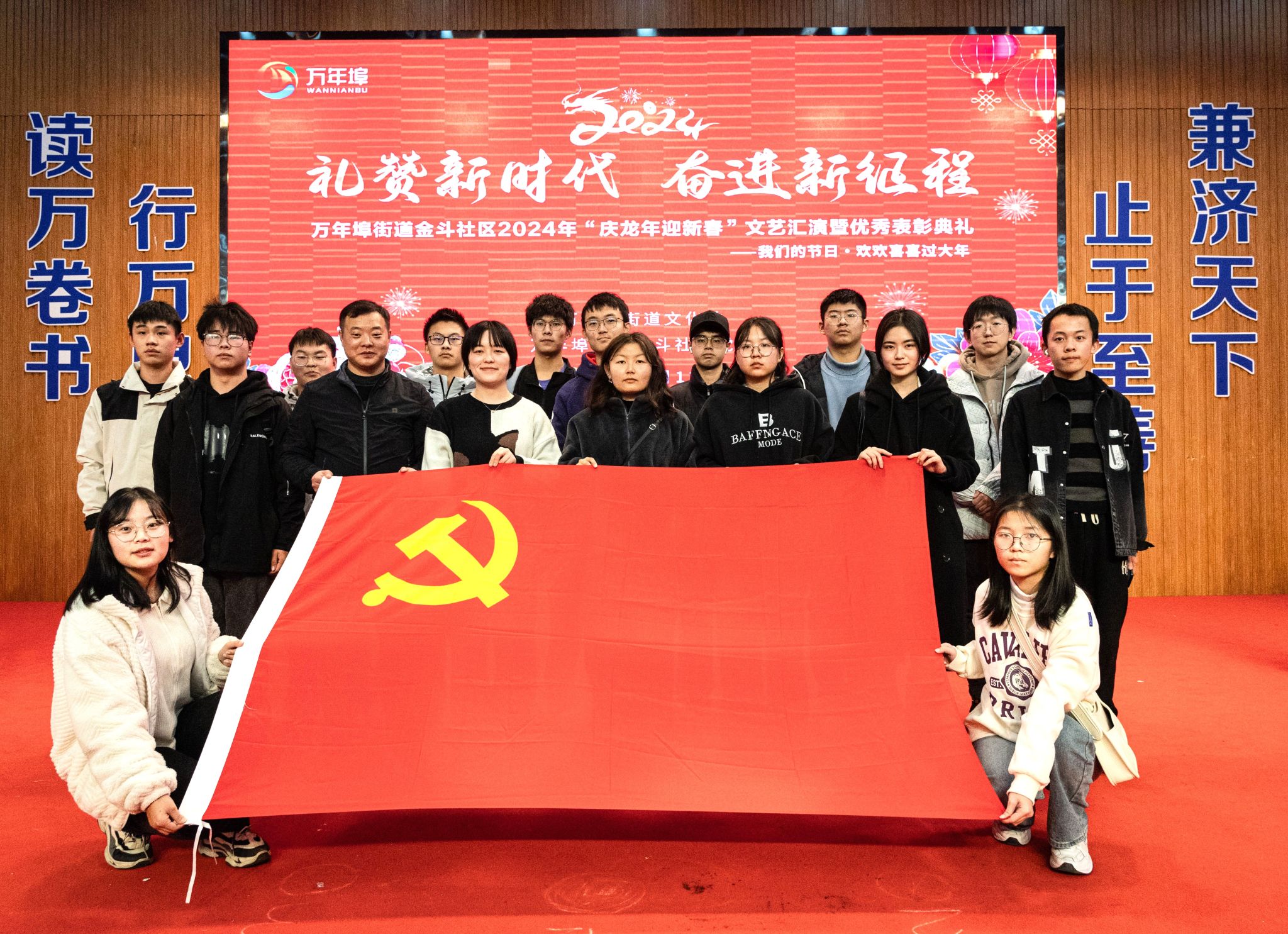 1月13日下午,jbo竞博官网登录本科生第二党支部赴万年埠街道金斗社区参加“礼赞新时代,奋进新征程”迎新春文艺汇演暨优秀表彰典礼。
