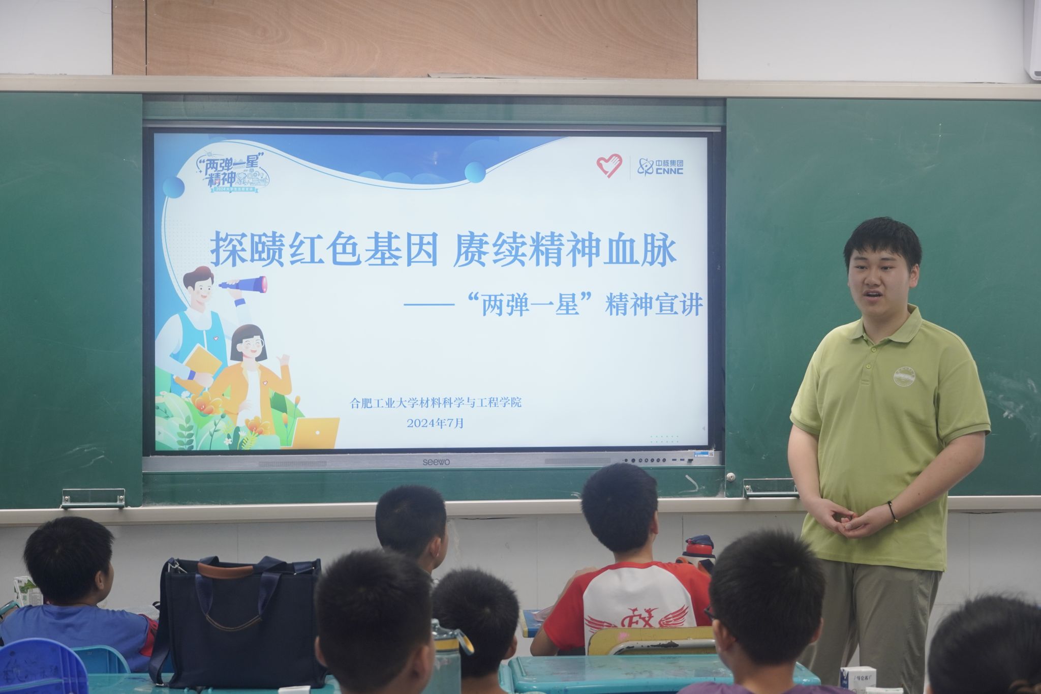 7月13日,jbo竞博官网登录“探赜两弹红色基因,赓续先辈精神血脉”“三下乡”暑期社会实践团队联合jbo竞博官网登录“青春飞扬,筑梦翱翔”大学生志愿支教团队,赴肥西县三河镇政府中心学校开展科普宣讲思政课。课程向学生们普及“两弹一星”精神内涵,引导学生们树立正确的价值观和人生观,厚植爱国情怀。