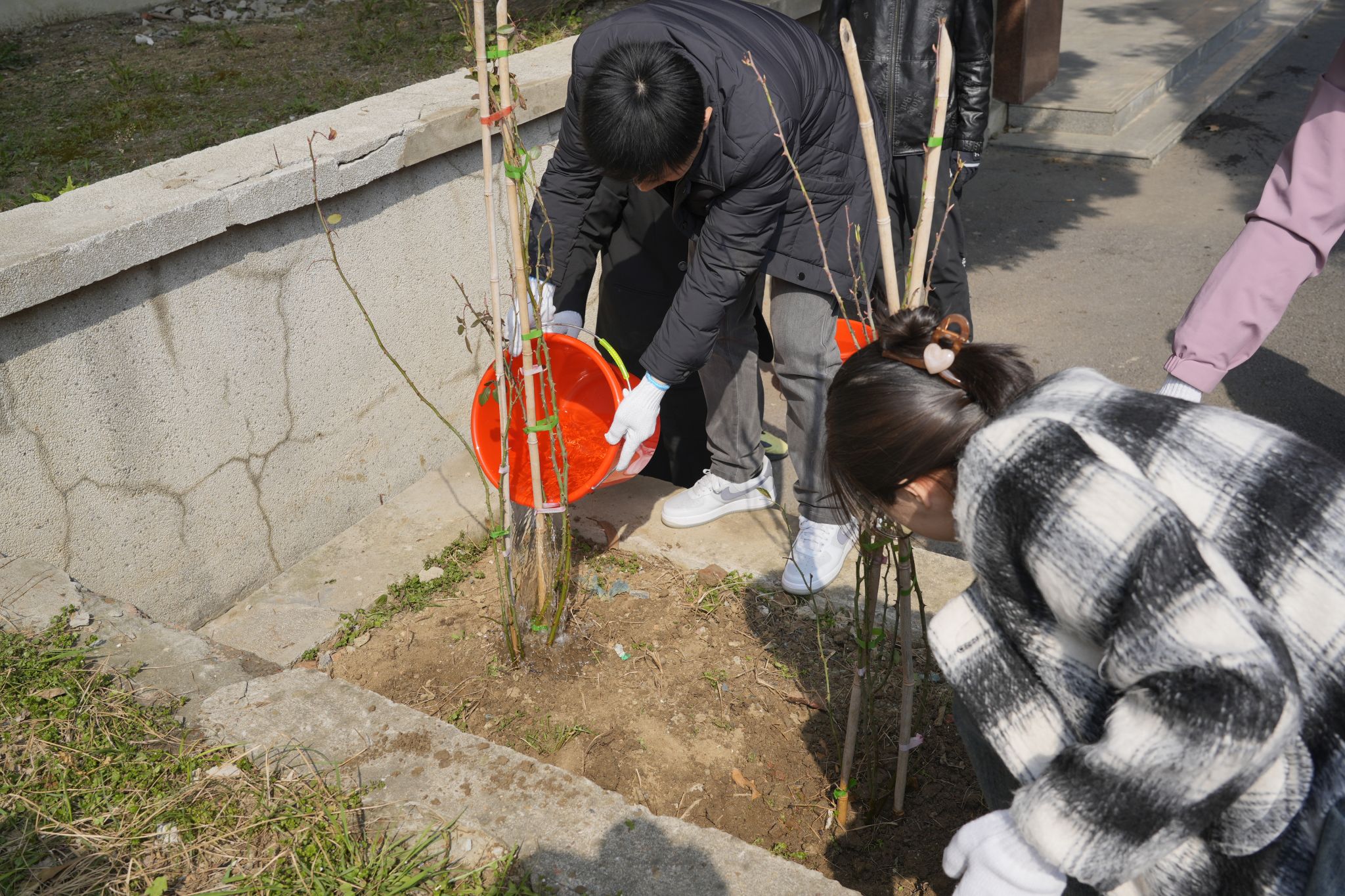 上午,在材料楼前的植树现场,jbo竞博官网登录机关党支部和本科生第二党支部师生热情饱满,齐心合力,干劲十足。师生一起挥锹铲土、栽种花苗、培土浇水,每道工序都一丝不苟,现场有条不紊的劳动场景成为材料楼前一道美丽的风景线。一番井然有序的忙碌后,一棵棵新栽种的月季花苗亭亭玉立。